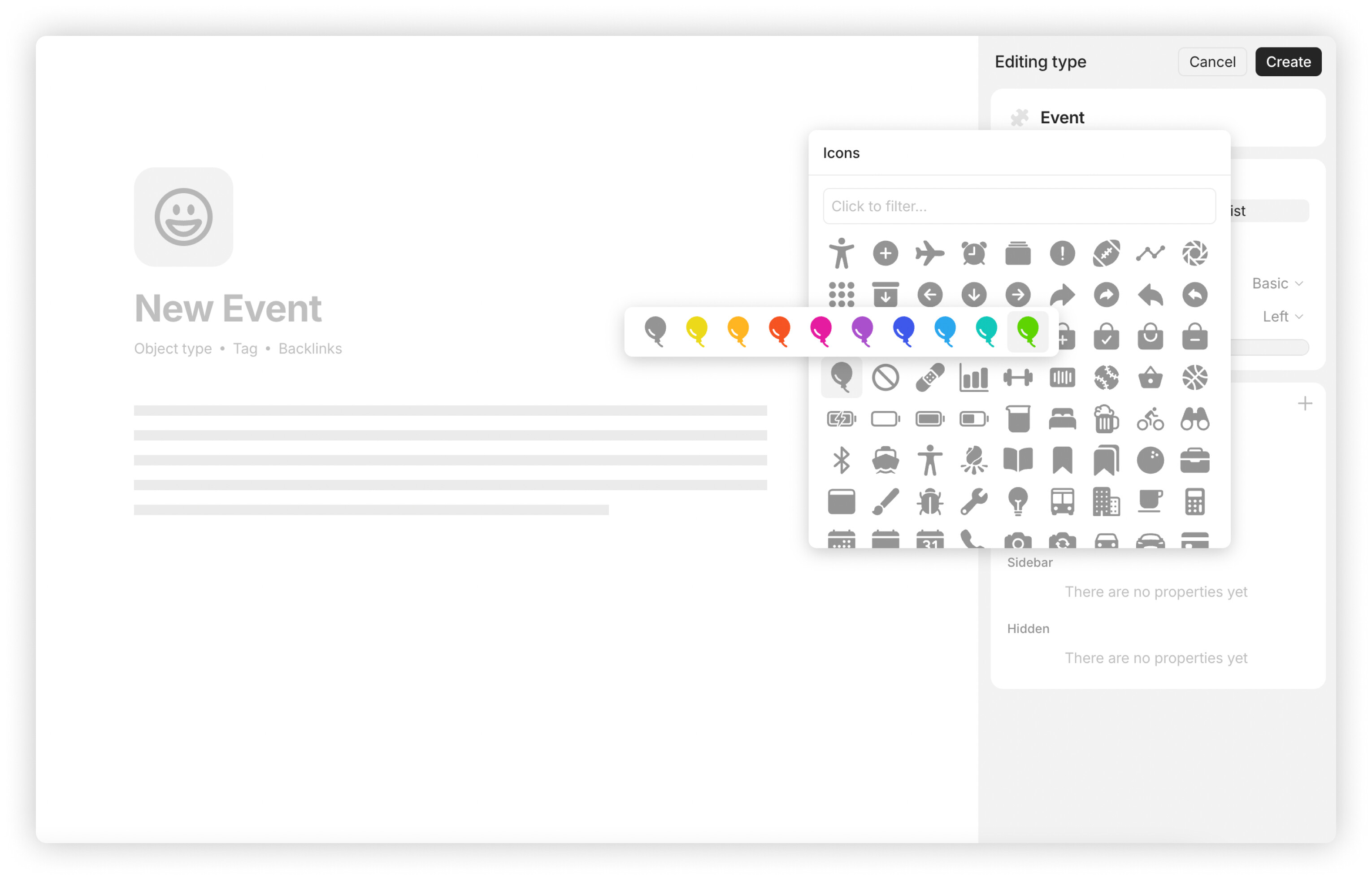 Properties that were previously set at the object level are now defined by Type, including both featured properties, such as backlinks or tags, and specific ones, such as date or source.