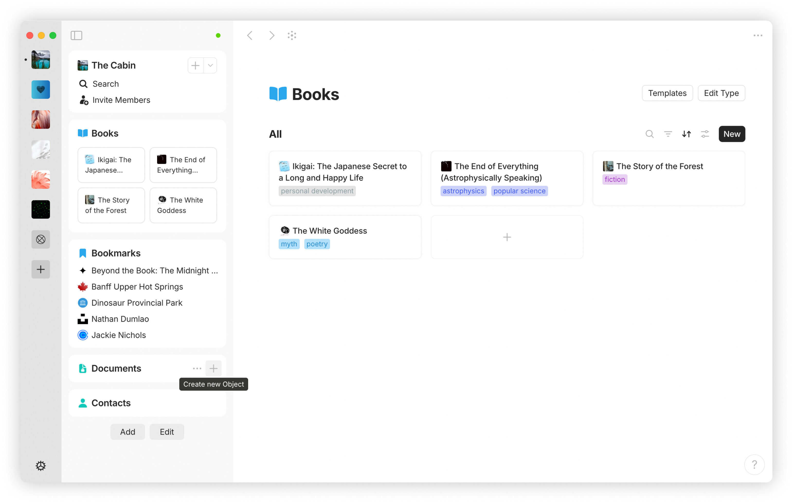 When you create the first object of a Type, a dedicated widget is automatically added to your sidebar. This widget displays all objects of that Type within the space, giving you quick access without any extra setup.