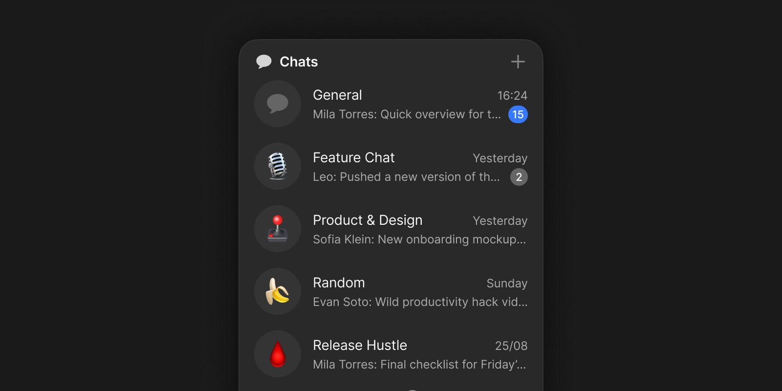Unlike other Widgets, pinned chats display counters and mention indicators directly in the Sidebar. A temporary Unread section also appears automatically when new messages arrive, listing chats with unread content.