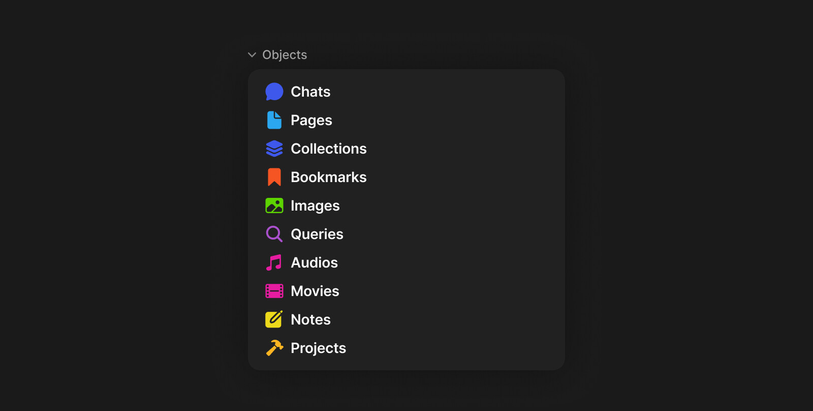 Chats are now native Objects in your Space. You can organize them into different views, assign tags to group related conversations, include them in Collections or Queries, and @-mention them from any Object for cross-referencing. As a system Type, Chat doesn’t support templates or layout changes.