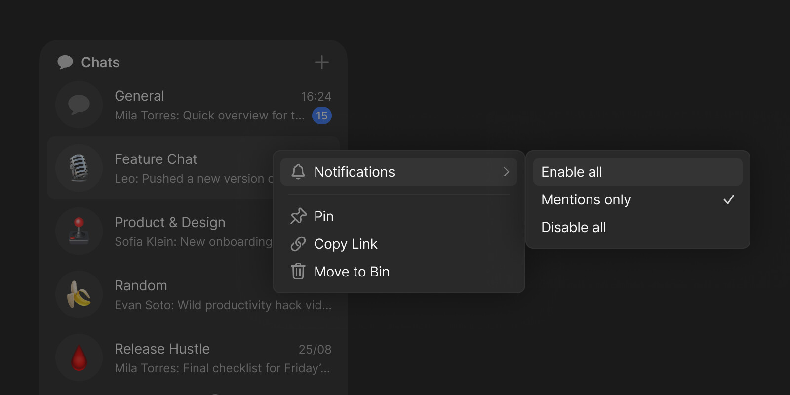 The Context Menu has been updated and now surfaces key actions when the Vault is hidden. Alongside Channel Settings, it includes Pin and Mute options, Copy an Invite Link, and – importantly – access to the Bin.